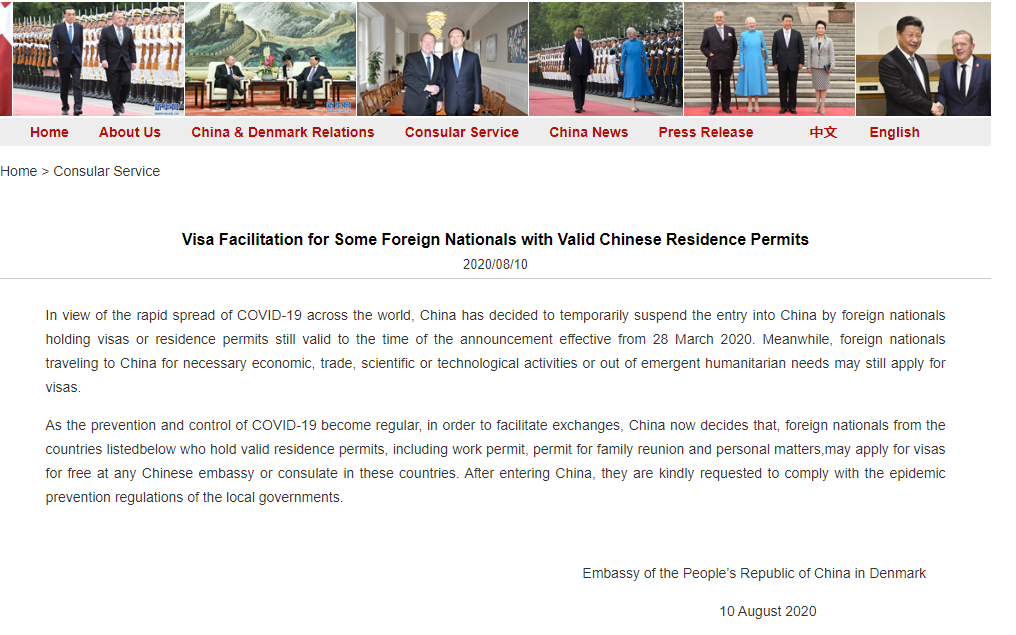 في العاشر من الشهر ، أصدرت السفارة الصينية في الدنمارك إشعارًا بشأن توفير تسهيلات التأشيرة للأجانب الذين يحملون تصاريح إقامة سارية في الصين: